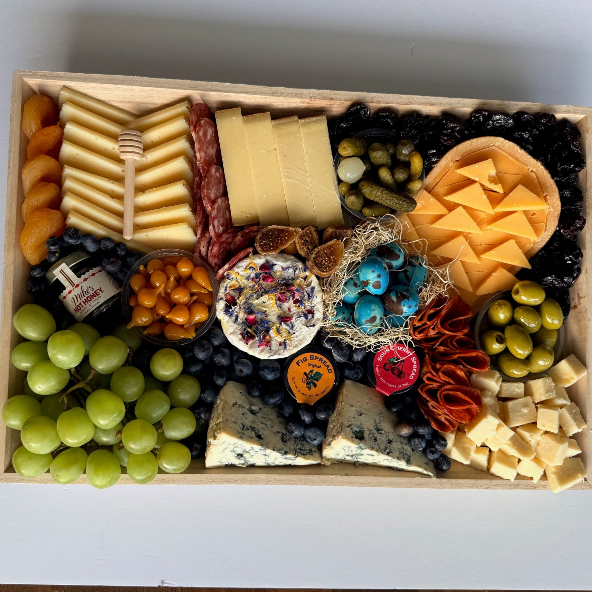 This is a special edition of our Medium Cheese & Charcuterie Board that includes the Knipschildt tiny hand-painted robin's eggs made of chocolate and salted caramel. These exquisite chocolate eggs are a feast for the eyes and the palate. These bright blue "robin's" eggs are handcrafted to perfection and the center of this board. Our handcrafted Medium Board includes 6 artisan cheeses, 2 cured meats, and some of our favorite accompaniments like seasonal fruit, honey, small batch jam, whole grain mustard, olives, cornichons, pickled veggies, dried fruit, chocolate, assorted nuts and more.